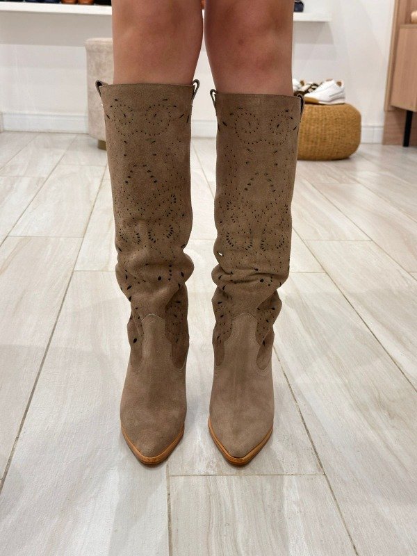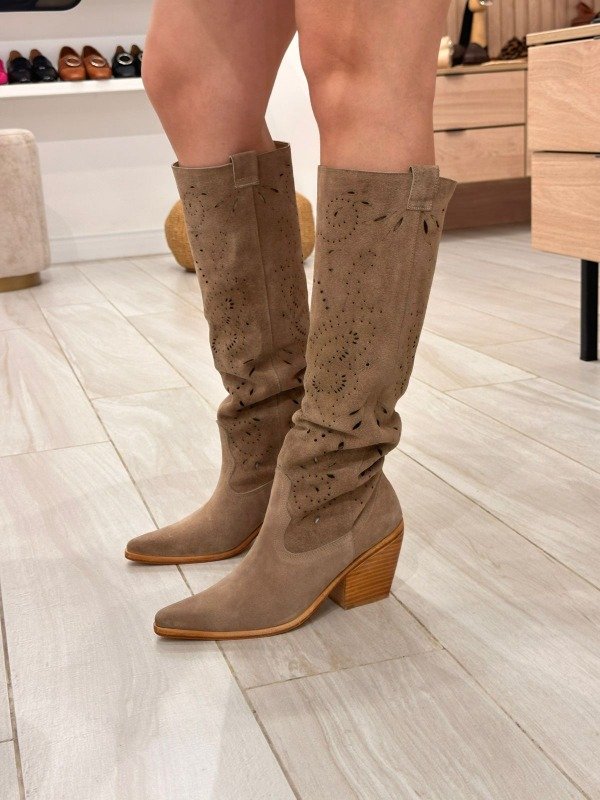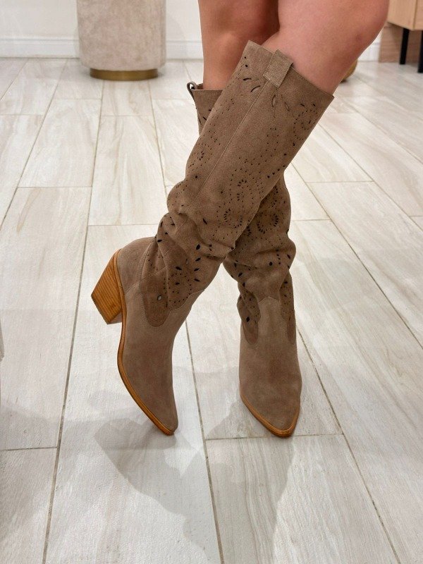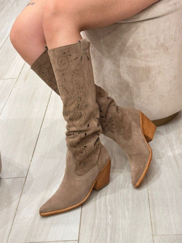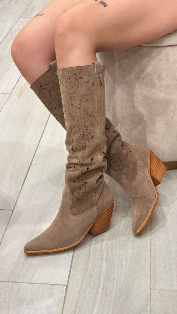Nuestra bucanera de gamuzón vison combina estilo y comodidad con una silueta de inspiración texana. Confeccionada en cuero gamuzado suave al tacto, se adapta naturalmente a la pierna gracias a su caña sin forro, lo que le aporta una caída relajada y estilosa.