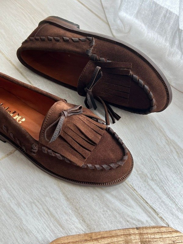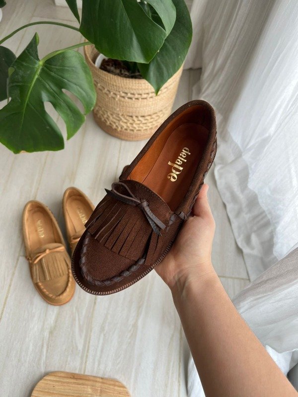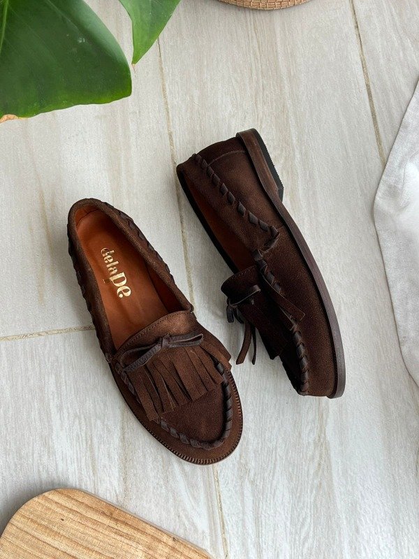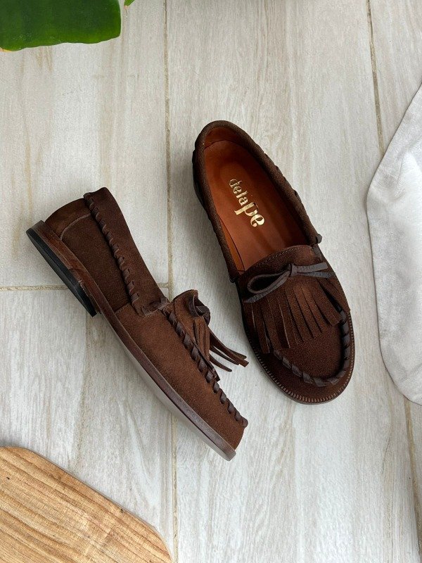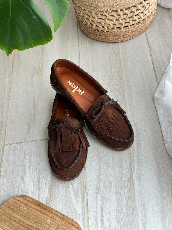 El mocasín Noa está confeccionado a mano en cuero gamuzón natural, color chocolate con terminaciones tejidas y flecos que reflejan el trabajo artesanal de DelaPe.