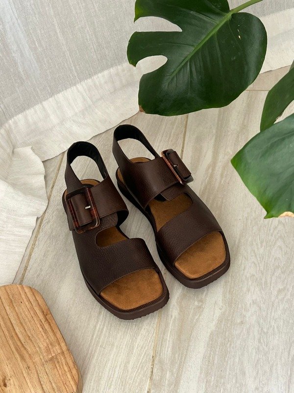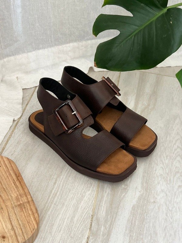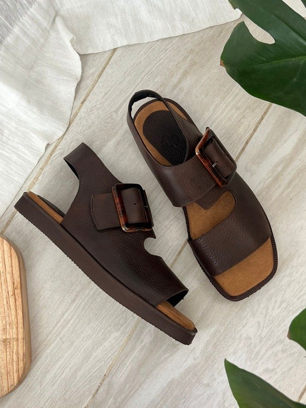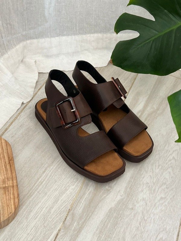 Sandalia de cuero vacuno. Interior forrado en cuero. Posee cierre regulable con hebilla de carey.