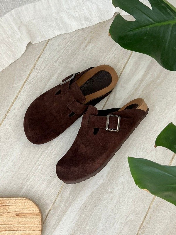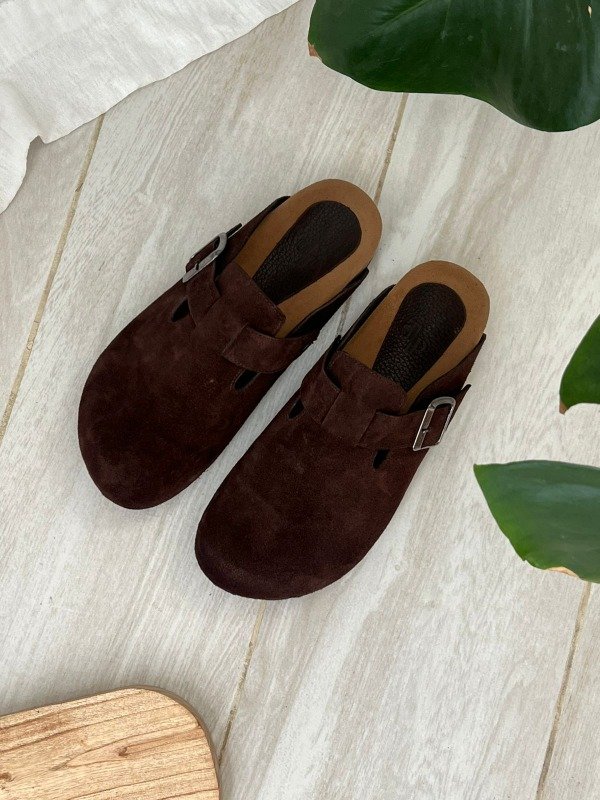 Descripción: Zueco en gamuzón chocolate con hebilla artesanal niquel. Forrería cuero vacuno. Plantilla birk y suelin de goma.